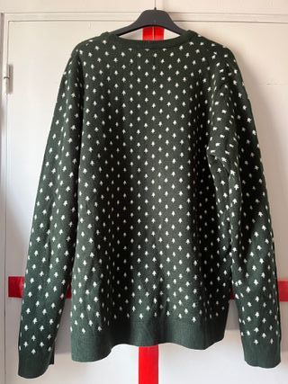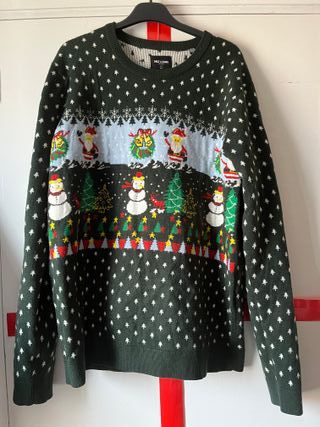 Jersey de punto con estampado navideño de la marca ONLY&SONS. Talla: L/Grande, pero es más una M. - Diseño con motivos de Papá Noel, muñecos de nieve y árboles. - Base de color verde oscuro con estampado de pequeños árboles blancos. - Cuello redondo y manga larga.