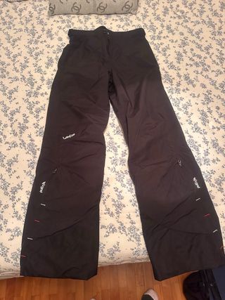 Pantalones de nieve de la marca Quechua en color negro con detalles rosas talla 38 ajustable. Chaqueta Quechua en conjunto con el pantalón talla 36 (xxs). Solo puesto 2 veces. Pantalón Tijuana talla 42 (L) ajustable. Este tiene los bajos un poco rotos porque tiene más uso. Las 3 piezas 100€. Lo vendo por separado también.