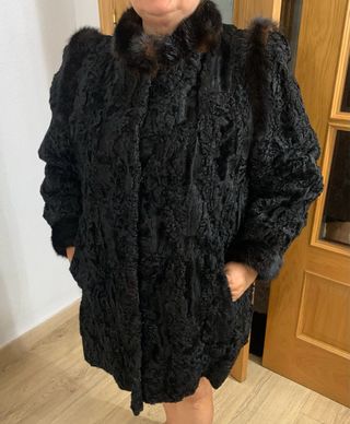 Elegante abrigo de piel para mujer. - Diseño de pelo rizado. - Cuello y detalles de pelo de zorro. - Corte largo.