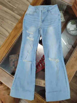 Pantalón vaquero de corte acampanado con rotos. - Talla 28, equivale a una talla 36. - Lavado claro. - Diseño desgastado. Se puede recoger en Alcalá de Henares o en Madrid en algunas ocasiones