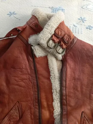 Chaqueta tipo bomber de piel con forro interior. - Piel de cordero auténtica. - Años 90 poco uso. - Talla 42 - Diseño clásico. - Cuello alto con cierres. - Bolsillos frontales.