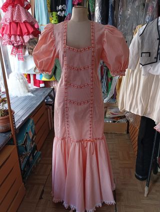 Conjunto de trajes de chulapa para mujer y niña. Diseños inspirados en la tradición. - Estampado de rayas finas en tonos naranjas y blancas. - Adornos de corazones en el corpiño y mangas abullonadas. - Tira bordada en todo el traje, en el filo del volante, en las mangas. Cinta naranja. - Precio del traje de mujer 100€. - Precio del traje de niña 55€. - Los dos juntos 145€.