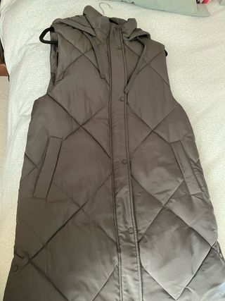 Chaleco largo acolchado con capucha, marca Easy Wear, talla L: - Diseño acolchado en rombos. - Cierre de botones a presión. - Bolsillos laterales. - Cordones ajustables en la capucha.
