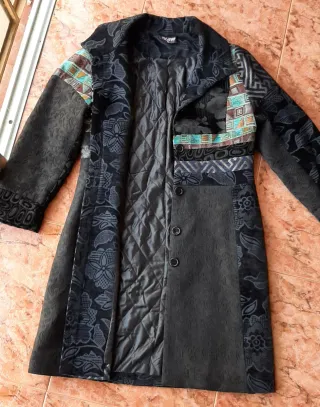 Abrigo de mujer con un diseño patchwork único y llamativo. - Combinación de tejidos con diferentes texturas y estampados. - Mangas largas. - Cuello solapa. - Cierre botones - Acolchado por dentro, da calor, cómodo y ligero - Poliester
