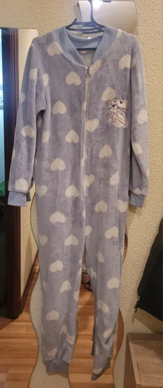 Pijama entero de forro polar con estampado de corazones blancos sobre fondo azul claro. Tiene cremallera frontal y un dibujo de un personaje en el pecho. - Material: Forro polar. - Diseño: Estampado de corazones. - Cierre: Cremallera frontal.