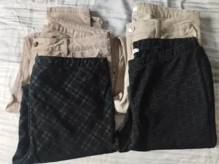 Conjunto de cuatro pantalones para mujer. - Dos pantalones de color uno beige y otro verde, corte vaquero ajustado talla 44. - Dos pantalones tipo leggins elasticos de color negro con estampado tacto aterciopelado XL equivale a talla 44. El precio es por el lote de cuatro unidades.