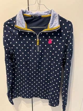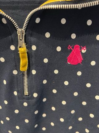 Polo de manga larga con un divertido estampado de lunares blancos sobre fondo azul marino. Presenta un cuello camisero y cierre de cremallera parcial en la parte delantera. - Diseño de lunares. - Cuello camisero. - Cierre de cremallera.