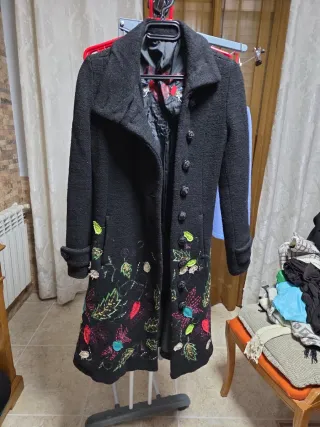 Elegante abrigo con un diseño desigual y un llamativo bordado floral. - Diseño asimétrico. - Detalle de bordado multicolor en hojas y flores. - Cierre de botones. -Dos bolsillos delanteros