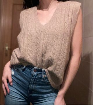 Chaleco de punto fino, ideal para llevar sobre otras prendas. Su tejido es suave y ligero. - Composición: 10% lana, 10% camello. - Diseño de trenzas. - Cuello en pico.