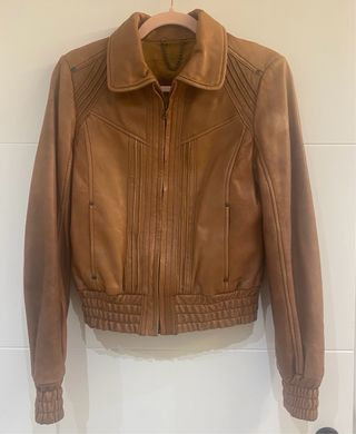 cazadora de mujer talla M (aunque la talla equivaldria a una S-M) de piel 100% marrón en perfecto estado cierre con cremallera y elástico en las mangas.