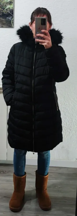 Chaqueta de invierno para mujer con un diseño moderno y cálido. - Capucha con pelo sintético negro. - Cierre frontal con cremallera. - Bolsillos laterales con cremallera. - Puños ajustables.