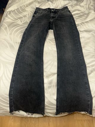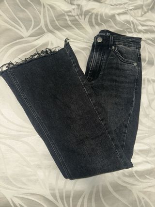 Vaqueros de campana en color negro con un moderno acabado desgastado en el bajo. - Diseño de campana. - Bajo deshilachado. - Tiro alto.
