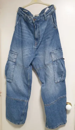Vaqueros de corte ancho y estilo cargo. - Bolsillos laterales con solapa. - Cintura alta. - Diseño de cinco bolsillos.