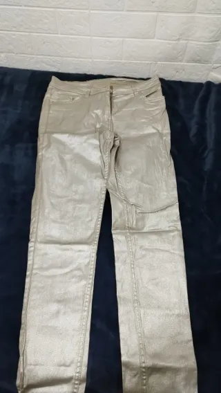 Pantalón de corte recto con un acabado brillante. - Diseño de cinco bolsillos. - Cierre de cremallera y botón. - Costuras decorativas en los laterales.