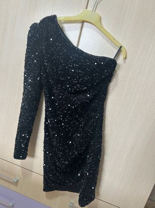 Vestido de fiesta con un diseño elegante y llamativo. - Diseño de lentejuelas. - Corte asimétrico. - Manga larga.