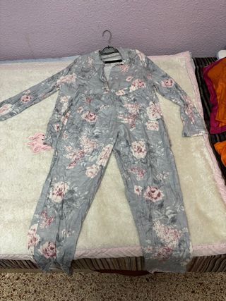 Conjunto de mujer con estampado floral. La parte superior es de manga larga y la parte inferior son pantalones. - Estampado floral en tonos grises y rosas. - Diseño de dos piezas.
