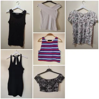 Se vende ropa para mujer nueva en perfectas condiciones, sin utilizar. Oferta: 2 prendas x 10€. 3 prendas x 15€. 4 prendas x 20€. 5 prendas x 25€. 6 prendas x 30€. Precios de prendas solas: - Camiseta de tirantes negra de Vinceotto talla S/ 36/ 8 por 5€. - Vestido negro de Lefties talla S/ 36/ 8 por 8€. - Camiseta blanca con pecho cruzado talla S/ 36/ 8 por 8€. - Crop top de rayas de Atmosphere talla S/ 36/ 8 por 4€. - Crop top negro de Tezenis talla S/ 36/ 8 por 5€. - Camiseta blanca de Bershka talla S/ 36/ 8 por 7€.