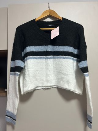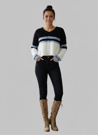 Jersey de mujer con un diseño moderno y rayas. - Manga larga. - Cuello en V. - Corte cropped.