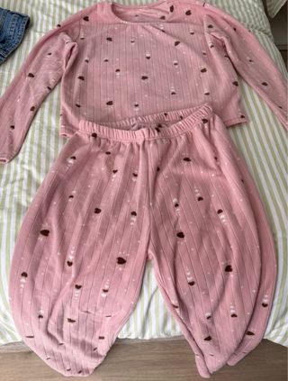 Conjunto de pijama suave y calentito. - Tejido acanalado. - Estampado de corazones y detalles blancos. - Pantalón con corte holgado.