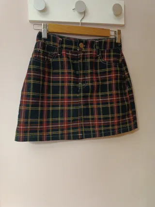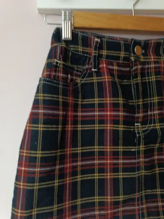 Falda de cuadros de Bershka. - Diseño de cuadros en tonos oscuros con detalles rojos y amarillos. - Cintura con trabillas y cierre de botón y cremallera. - Bolsillos delanteros y traseros.