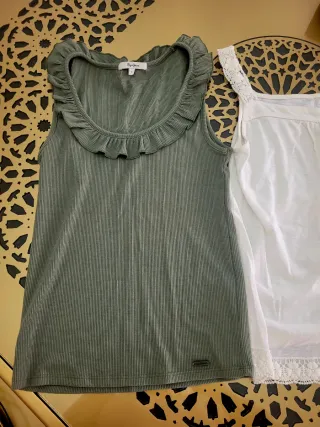 Conjunto de dos tops de la marca Pepe Jeans. - Top verde de canalé con volantes. - Top blanco con tirantes de encaje y detalles de puntilla en el bajo.