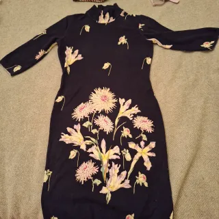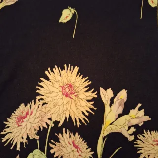Elegante vestido de Blumarine con un estampado floral vibrante. - Diseño de manga larga. - Cuello alto. - Estampado de flores en tonos rosas y amarillos sobre fondo negro. -talla 40 equivale a 38 española .tiene elastine por lo que es elastico y se adapta al cuerpo