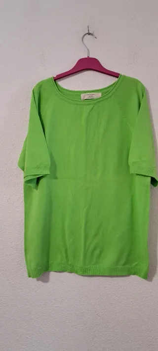 Jersey de punto fino de Zara en un llamativo color verde lima. Tiene un diseño de manga corta y un acabado con puntilla en el cuello y los puños. - Tejido ligero y transpirable. - Detalle de puntilla en cuello y mangas. - Corte recto.