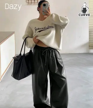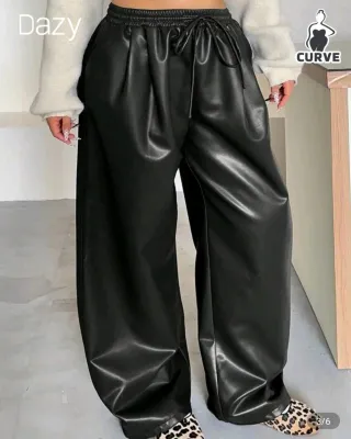 Pantalón de corte recto confeccionado en piel sintética. - Cintura con cordón ajustable. - Diseño holgado y moderno. Estilo casual de calle, adecuados para otoño/invierno