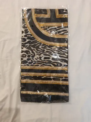 Elegante pañuelo de seda con un llamativo estampado de leopardo. Cada uno por 5 euros, Los tres pañuelos x 12 euros. Uno mad cuadrado otro mas grande y rectangular y el otro tira para cuello o lazo para pelo. - Diseño clásico. - Tacto suave y sedoso. - Borde en tono marrón.