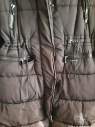 Abrigo acolchado de mujer. - Diseño semi largo. - Capucha. - Cierre de cremallera y botones. - Bolsillos con cremallera. - Lazo interno para ajustar en la cintura o usarlo suelto. - Con pelo desmontable para capucha (última foto). El color es totalmente negro. En algunas fotos sale distinto por el sol. Acolchado abrigado. No hago envíos! A retirar zona rambla Guipúzcoa y Bac de Roda (08020)