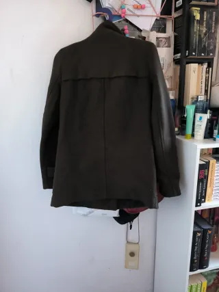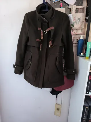 Chaqueta de paño con detalles de polipiel los cinturones marrones -1 boton está junto con el otro. - Cierre con botones y trabillas. - Bolsillos delanteros con solapa. - Puños abotonados.