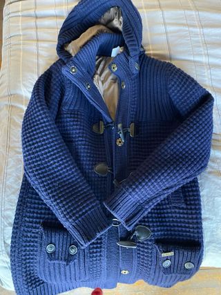 Parka de lana azul de la marca Bark. - Diseño de punto grueso. - Cierre con botones y toggles. - Capucha integrada. - Bolsillos frontales con botones.