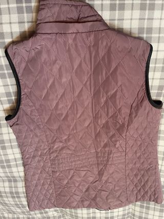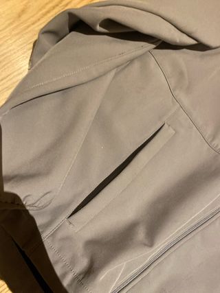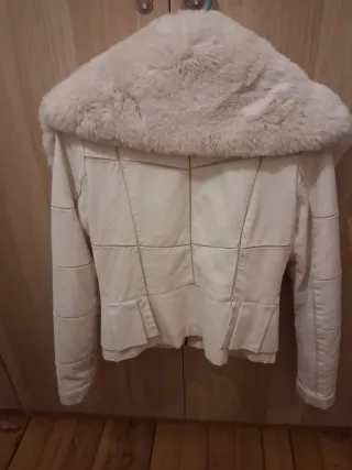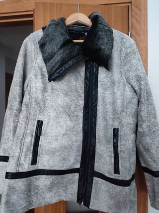 Chaqueta gris con pelo sintético interior, muy calentita. Tiene un pequeño desgaste en la parte de abajo de la cremallera. Ancho 60 cm, largo 68 cm