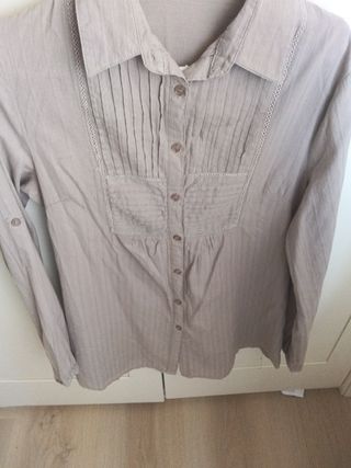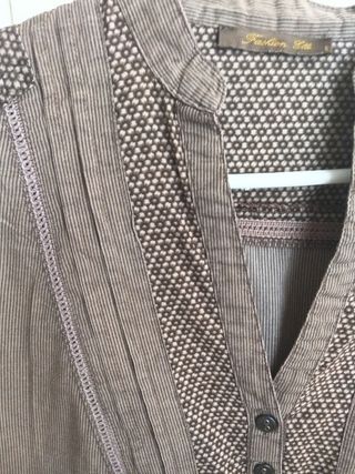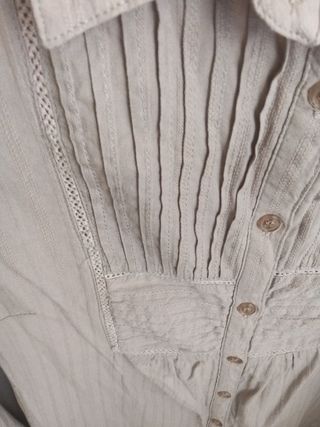 Blusa mujer en color tostado con delantera decorada con pequeño entredós y tablitas.La tela hace también una trama como a rayas.TallaM.Se le puede poner cinturón ,lleva trabillas.