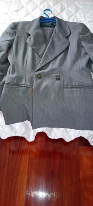 Elegante traje de mujer en color gris, compuesto por una chaqueta y un pantalón. Está en buen estado, aunque presenta algunas pequeñas manchas. - Chaqueta de dos botones. - Pantalón a juego. - Tejido de calidad.