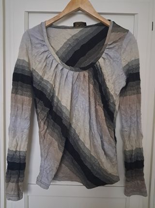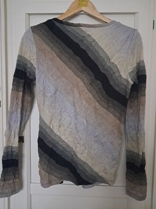Preciosa camiseta de manga larga para mujer. Es de color beige y marrón con un diseño de rayas diagonales. Tiene un estilo arrugado y textura suave. - Diseño de rayas - Manga larga - Cuello redondo Mide 45 de axila a axila y 62 cm de largo.