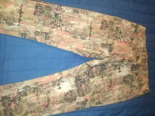 Pantalón largo para mujer con un diseño estampado único. - Estampado abstracto en tonos beige y rosa. - Corte largo y favorecedor.