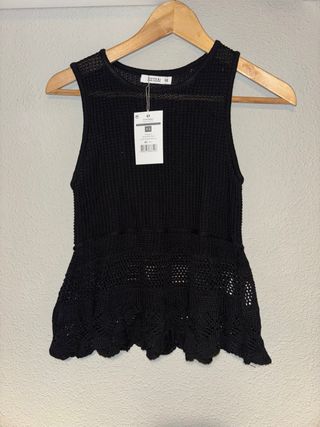 Top de tejido calado con un diseño moderno y favorecedor. - Diseño sin mangas. - Corte peplum. - Acabado festoneado en el bajo.