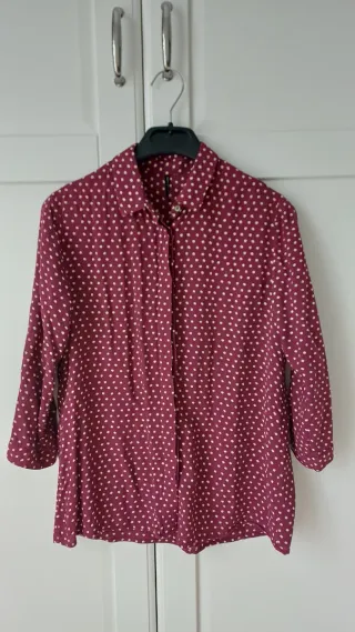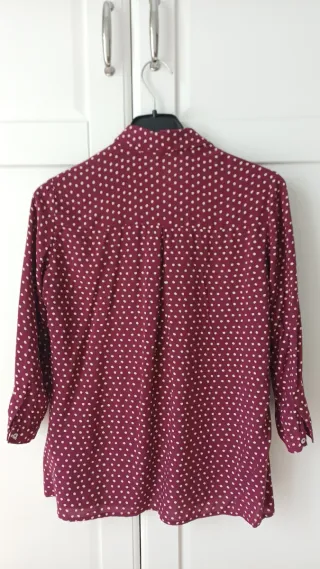 Camisa de manga tres cuartos con un estampado de lunares. - Diseño de lunares blancos sobre fondo burdeos. - Cuello camisero. - Cierre de botones.