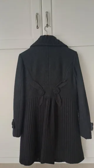 Elegante abrigo negro de la marca SLPH. Presenta un diseño clásico con detalles que le dan un toque especial. - Cuello con textura acanalada. - Adornos florales en el cuello. - Cierre de doble botonadura con botones redondos. - Bolsillos frontales con solapa y botón. - Puños vueltos.