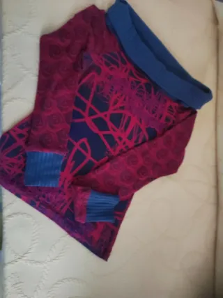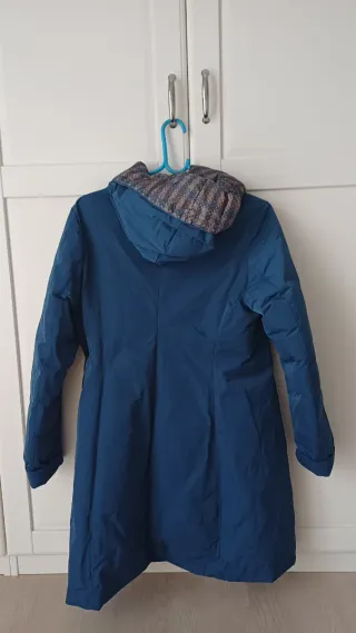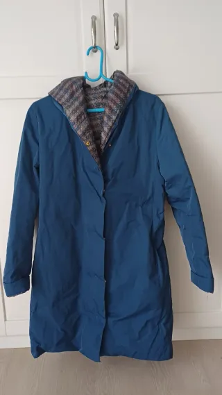 Chubasquero reversible con un diseño moderno. - Exterior de color azul. - Interior con estampado multicolor. - Cierre de cremallera y botones. - Talla M tirando a L. Bastante acolchada y abrigada.