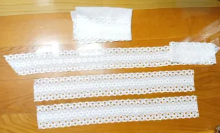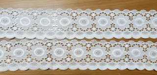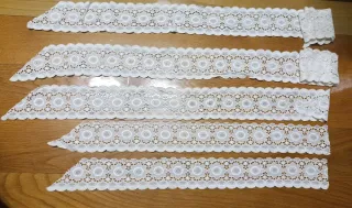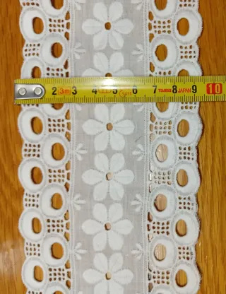 Lote de encaje vintage de batista bordada, ideal para manualidades o arreglos. Algodón 100% Ancho 8,5 cm. 1 pieza de 8,5x130cm. 2 piezas de 8,5x70 cm. cada Regalo pieza de última foto - Diseño floral. - Bordado detallado. - Borde festoneado.
