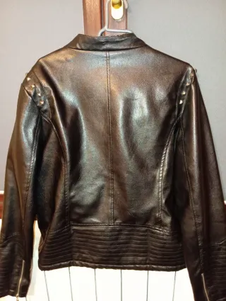 Cazadora de polipiel con un diseño moderno y detalles que marcan la diferencia. - Cierre de cremallera frontal. - Bolsillos con cremallera. - Tachuelas decorativas en hombros y mangas. - Costuras verticales en el delantero y trasero. Tiene el cuello un pelin desgastado(foto)