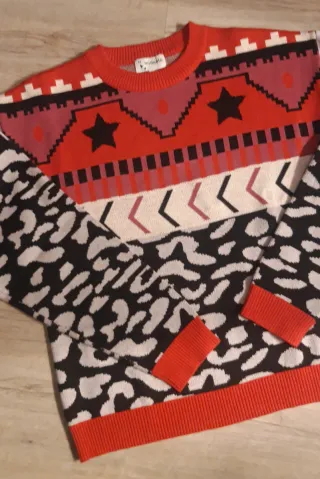 Jersey de punto con estampado llamativo y moderno. - Diseño multicolor con detalles geométricos y estrellas. - Mangas con estampado de leopardo. - Puños y bajo en color rojo. - Cuello redondo.