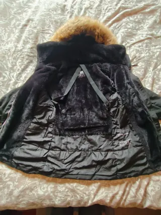 Parka negra de invierno con capucha. - Forro interior de pelo sintético. - Capucha con pelo sintético.