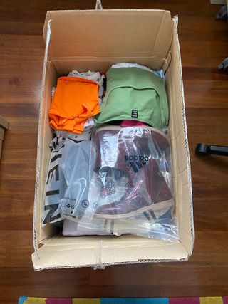 Caja con ropa variada para mujer. - Alrededor de 45 prendas - Contiene zapatillas, botas, tops, pantalones, mallas de deporte, bikinis, sudaderas y un abrigo ( tallas desde S a M), zapatos ( 37 )