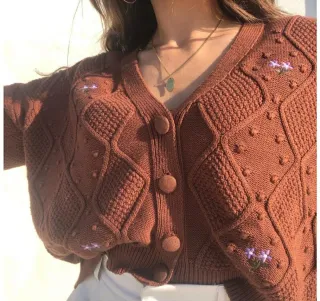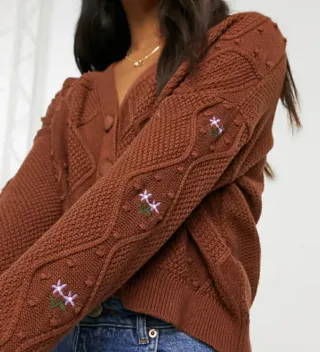 Chaqueta de punto para mujer con un diseño tejido y detalles bordados. - Tejido de punto texturizado. - Motivos florales bordados en las mangas. - Cierre de botones. - Cuello en V.