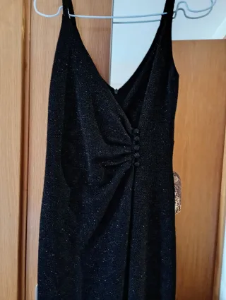 Elegante vestido largo con un toque brillante, ideal para eventos especiales. - Diseño con tirantes finos. - Escote en V. - Detalle fruncido en la cintura. - Abertura lateral en la falda.
