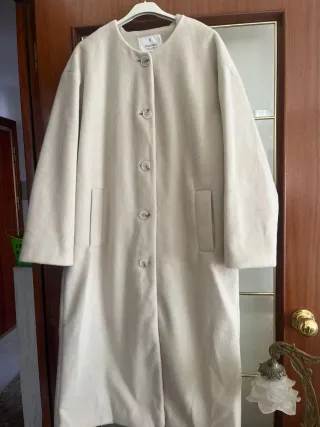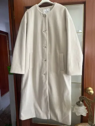 Abrigo largo en color beige, como nuevo y con muy poco uso. Ideal para mantenerte abrigado con estilo. - Talla L. - Cierre de botón. - Cuello solapa.