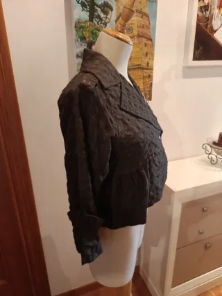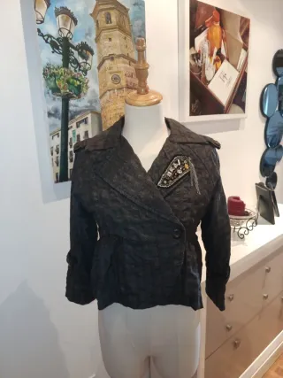 Elegante chaqueta de Adolfo Dominguez con un diseño moderno y sofisticado. - Corte entallado. - Cierre cruzado con botón. - Cuello solapa. - Detalle de broche decorativo en la solapa. - Mangas largas con puños abullonados.